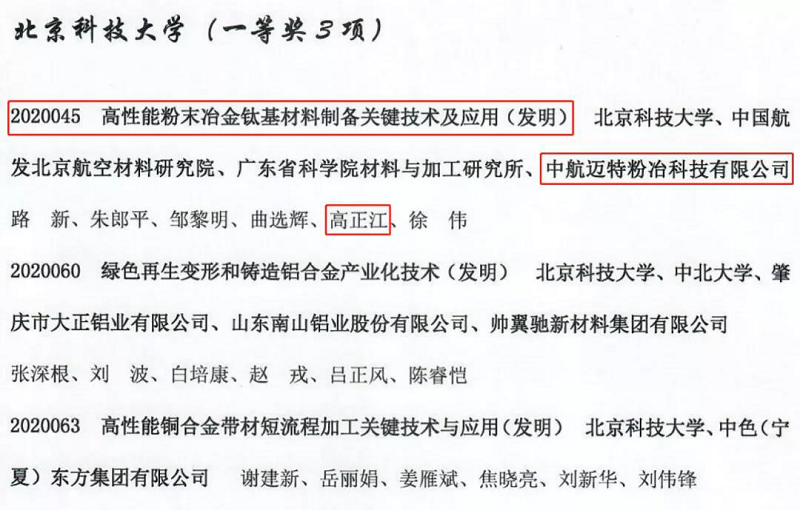 近日,中國有色金屬工業(yè)協(xié)會發(fā)布《關(guān)于頒發(fā)2020年度中國有色金屬工業(yè)科學(xué)技術(shù)獎的通知》,中航邁特聯(lián)合北京科技大學(xué)、中國航發(fā)北京航空材料研究院、廣東省科學(xué)院材料與加工研究所申報的“高性能粉末冶金鈦基材料制備關(guān)鍵技術(shù)及應(yīng)用”項目成功摘“星”——榮獲2020年中國有色金屬工業(yè)科學(xué)技術(shù)獎一等獎。