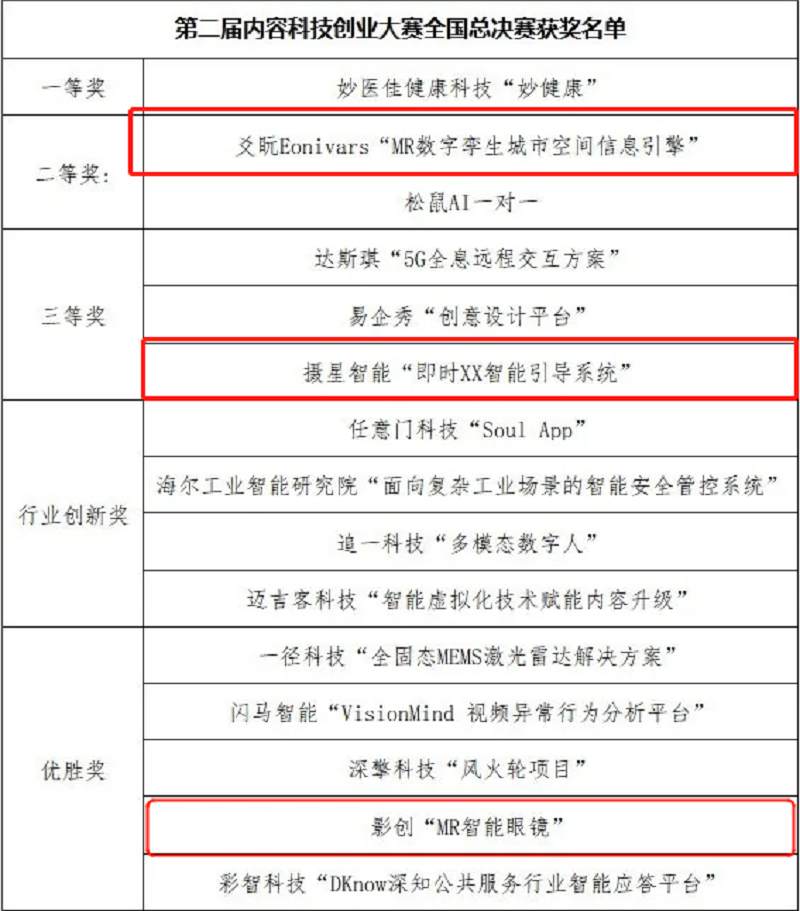 12月19日,第二屆中國內(nèi)容科技創(chuàng)業(yè)大賽全國總決賽暨頒獎盛典在廈門舉辦。悉見爻盶Eonivars城市MR空間互聯(lián)網(wǎng)引擎以0.2分之差未能折桂,獲全國第二名。此外,悉見合作伙伴影創(chuàng)“MR智能眼鏡”項目也獲得優(yōu)勝獎。