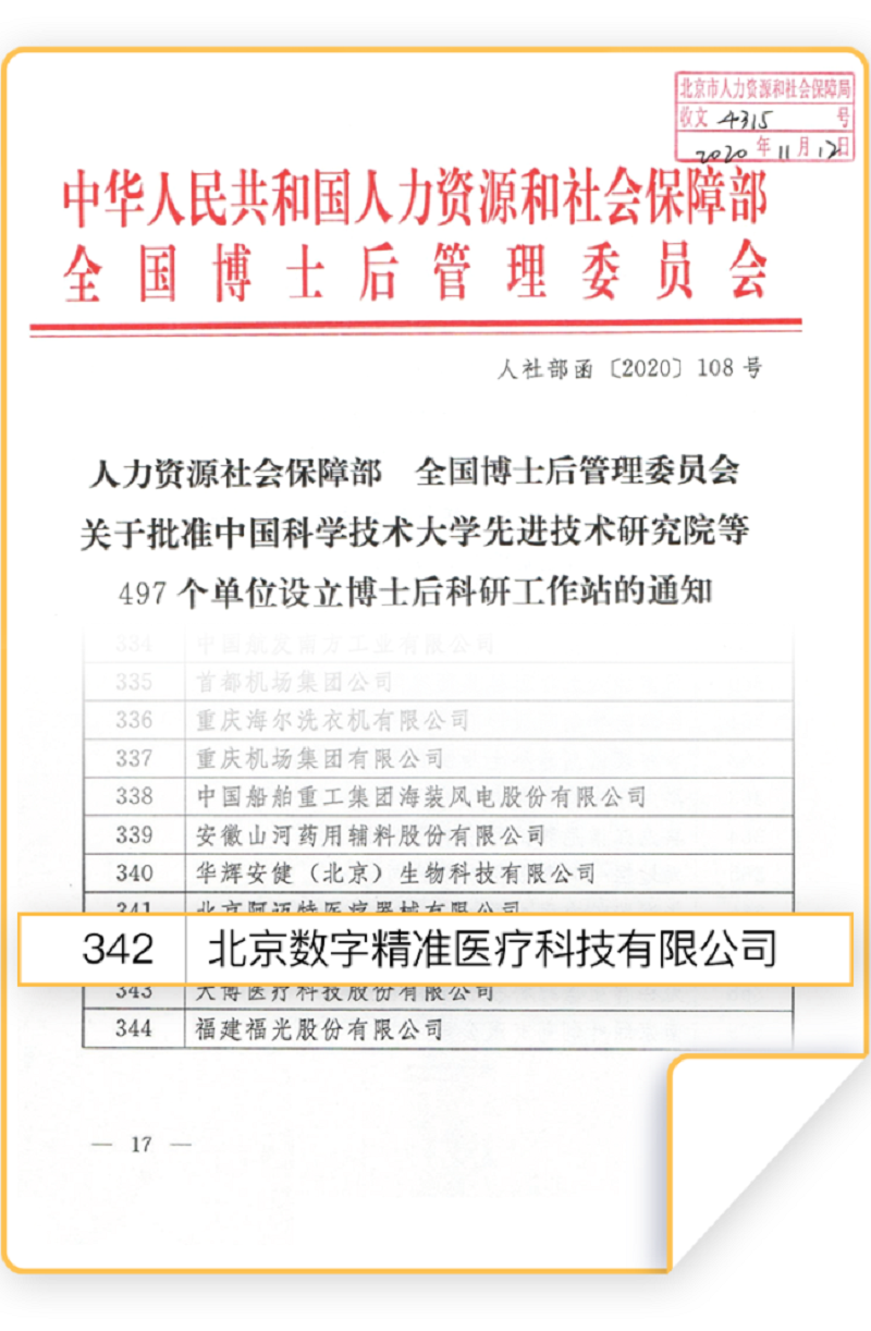 人社部,全國博士后管委會近日聯(lián)合發(fā)文(人社部函[2020]108號)批準(zhǔn)497個單位設(shè)立博士后科研工作站。北京數(shù)字精準(zhǔn)醫(yī)療科技有限公司(下稱:數(shù)字精準(zhǔn)醫(yī)療)歷經(jīng)嚴(yán)格審核、篩選,在全國各大科研技術(shù)類機(jī)構(gòu)中脫穎而出,獲批設(shè)立“國家博士后科研工作站”。此次獲批,不但對企業(yè)的科技創(chuàng)新發(fā)展有著重大推動,更是企業(yè)科研人才培育工程的一個全新里程碑。