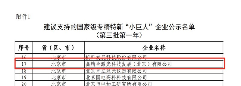 5月17日,工業(yè)和信息化部公布了第三批建議支持的國(guó)家級(jí)專(zhuān)精特新“小巨人”企業(yè)名單,鑫精合激光科技發(fā)展(北京)有限公司喜獲入選!