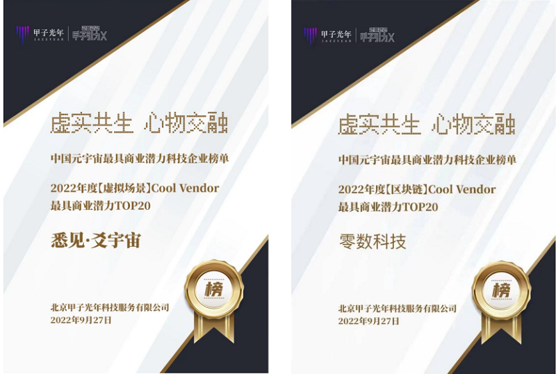 9月27日,在甲子光年主辦的2022元宇宙峰會上,發(fā)布了“2022中國元宇宙最具商業(yè)潛力科技企業(yè)榜單”。榜單旨在表彰2021-2022年度在元宇宙賽道上擁有核心技術實力,并在商業(yè)化上頗有成效的優(yōu)秀成長型科技公司。悉見科技和零數(shù)科技榮登該榜,分別成為2022年【虛擬場景】Cool Vendor最具商業(yè)潛力的TOP20和2022年度【區(qū)塊鏈】Cool Vendor最具商業(yè)潛力TOP20企業(yè)。
