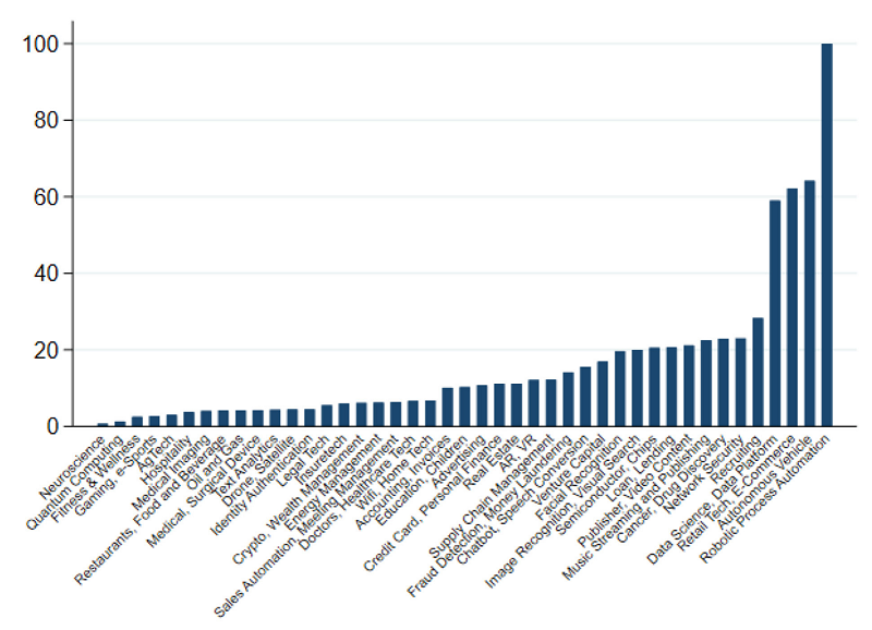 圖2.人工智能發(fā)展的主要領域(2010-2020年,全球累計投資美元;機器人過程自動化 = 100)