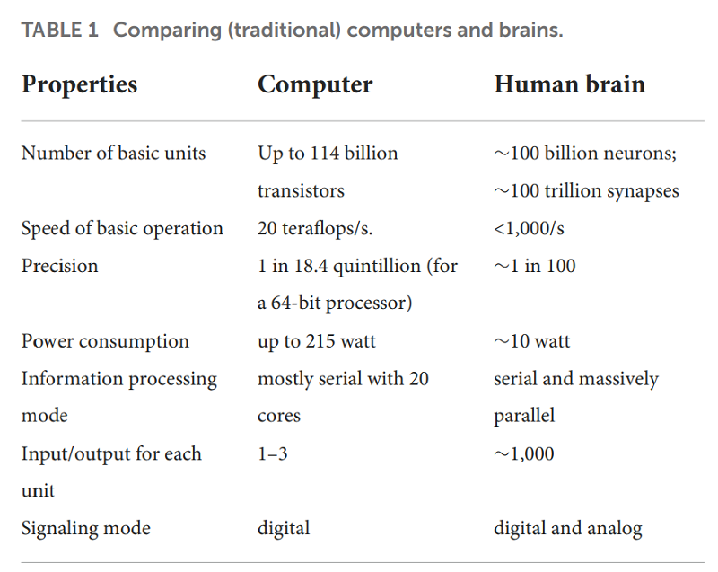 然而,二者的直接比較揭示了性能和效率方面的顯著差異(見表1)。特別是,在能耗和執(zhí)行計算的精度/速度方面,單個人類神經元相當緩慢和不精確。但它們比計算機中的晶體管強大得多,顯示出比簡單的二元激活電位更復雜的活動模式。另一方面,計算機可以以更高的速度和精度進行計算,盡管它們中的大多數處理的晶體管更少,并且連接起來的激活模式要簡單得多,但這種更高的精度和速度以更高的能耗形式付出了巨大的代價。