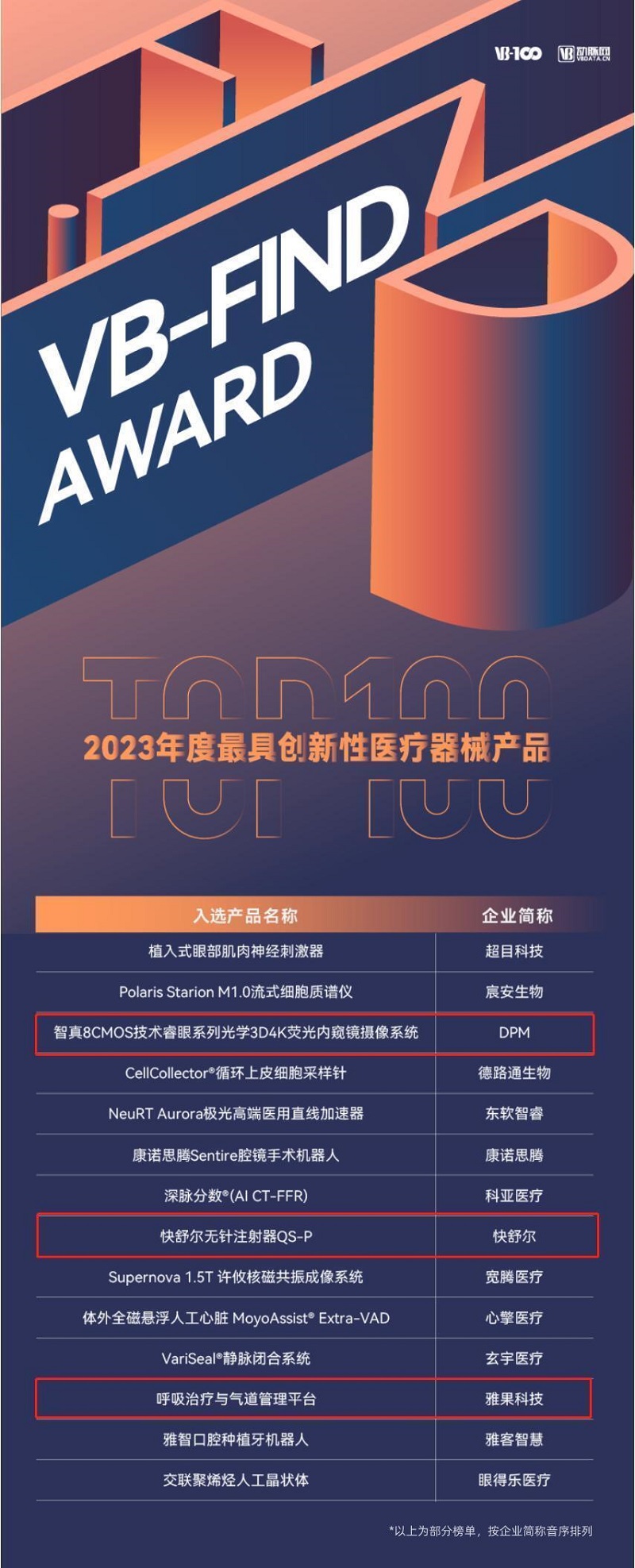 近日,VB-Find Award“2023年度最具創(chuàng)新性醫(yī)療器械產(chǎn)品(解決方案)TOP100”正式發(fā)布。金科君創(chuàng)資本投資的企業(yè)中,數(shù)字精準(zhǔn)的“智真8CMOS技術(shù)睿眼系列光學(xué)3D4K熒光內(nèi)窺鏡攝像系統(tǒng)”、快舒爾的“無(wú)針注射器QS-P”、雅果科技的“呼吸治療與氣道管理平臺(tái)”光榮上榜,體現(xiàn)了企業(yè)卓越的技術(shù)水平和創(chuàng)新能力。