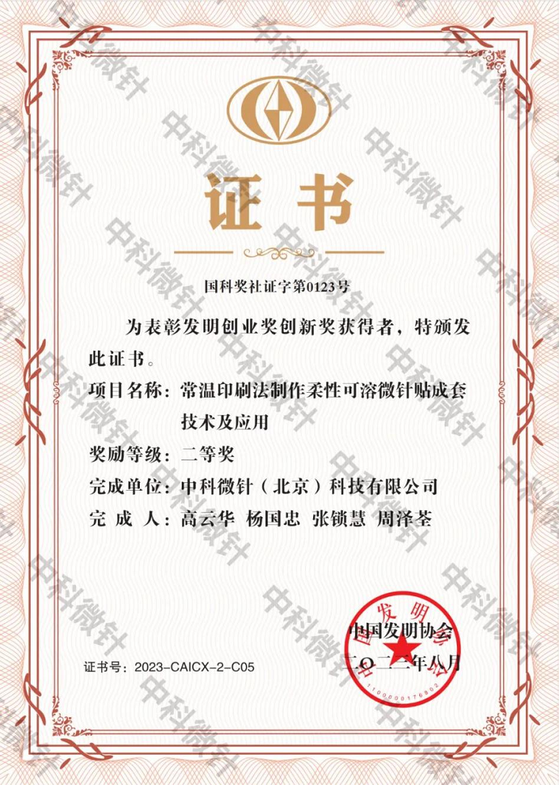 近日,中國(guó)發(fā)明協(xié)會(huì)公布了 2023 年度“發(fā)明創(chuàng)業(yè)獎(jiǎng)創(chuàng)新獎(jiǎng)”獲獎(jiǎng)名單,由君創(chuàng)Family企業(yè)中科微針(北京)科技有限公司(以下簡(jiǎn)稱(chēng)“中科微針”)申報(bào)的“常溫印刷法制作柔性可溶微針貼成套技術(shù)及應(yīng)用”項(xiàng)目喜獲二等獎(jiǎng)。