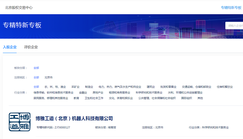 近日,金科君創(chuàng)資本投資的博雅工道(北京)機(jī)器人科技有限公司(簡(jiǎn)稱“博雅工道”)成功上板北京市“專精特新”專板,并入選培育層。在已經(jīng)上板的 123 家企業(yè)中,培育層企業(yè)只有 9 家,資質(zhì)要求最為嚴(yán)格,這充分體現(xiàn)了公司的卓越實(shí)力和發(fā)展?jié)摿Α?/span>