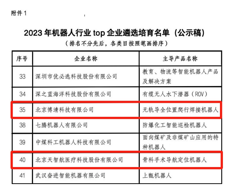 近日,由中國機械工業(yè)聯(lián)合會機器人分會聯(lián)合全國22家省市行業(yè)協(xié)會共同開展的2023機器人行業(yè)TOP企業(yè)遴選培育工作圓滿結(jié)束,正式對外發(fā)布了覆蓋機器人全產(chǎn)業(yè)鏈的50家頂尖企業(yè)名單。君創(chuàng)Family企業(yè)成員北京博清科技有限公司(以下簡稱“博清科技”)和北京天智航醫(yī)療科技股份有限公司(以下簡稱“天智航”)憑借其在技術(shù)創(chuàng)新、市場應(yīng)用、品牌影響力等方面的突出表現(xiàn),成功入選這一權(quán)威榜單。