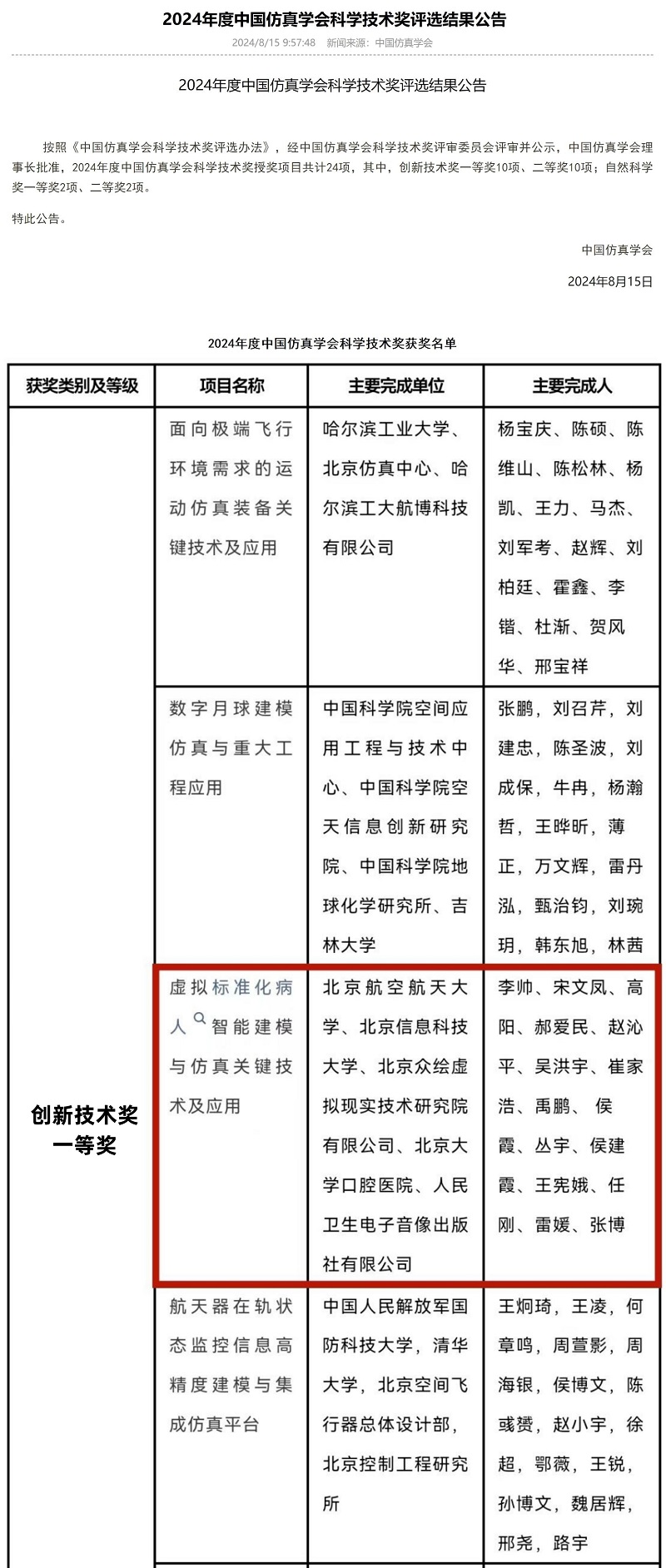 近日,中國仿真學(xué)會公布了2024年度科學(xué)創(chuàng)新技術(shù)獎獲獎名單,其中,君創(chuàng)Family成員企業(yè)——北京眾繪虛擬現(xiàn)實技術(shù)研究院有限公司(簡稱“眾繪科技”)參與的“虛擬標(biāo)準化病人智能建模與仿真關(guān)鍵技術(shù)及應(yīng)用”項目,榮獲創(chuàng)新技術(shù)獎一等獎。這一殊榮不僅是對企業(yè)在虛擬現(xiàn)實與仿真技術(shù)領(lǐng)域創(chuàng)新能力的肯定,更凸顯了其在推進醫(yī)療教育與技能培訓(xùn)方面的優(yōu)異成績。