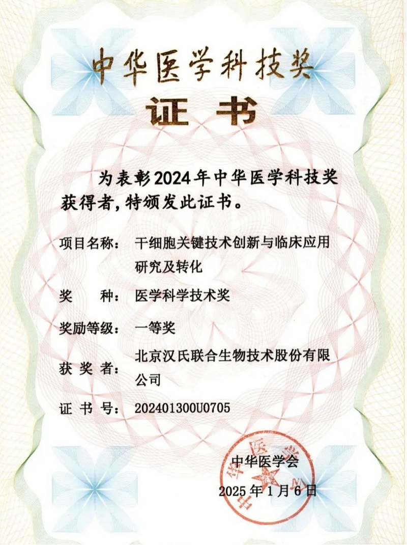 漢氏聯(lián)合:與貴州醫(yī)科大學(xué)等合作單位共同申報(bào)的“干細(xì)胞關(guān)鍵技術(shù)創(chuàng)新與臨床應(yīng)用研究及轉(zhuǎn)化”項(xiàng)目,憑借其卓越的創(chuàng)新性與實(shí)踐價(jià)值,榮獲中華醫(yī)學(xué)科技獎(jiǎng)一等獎(jiǎng)。迄今為止,漢氏聯(lián)合科研團(tuán)隊(duì)已累計(jì)榮獲國內(nèi)外權(quán)威科技類獎(jiǎng)項(xiàng)約30項(xiàng),彰顯了其在細(xì)胞科研領(lǐng)域的卓越實(shí)力。