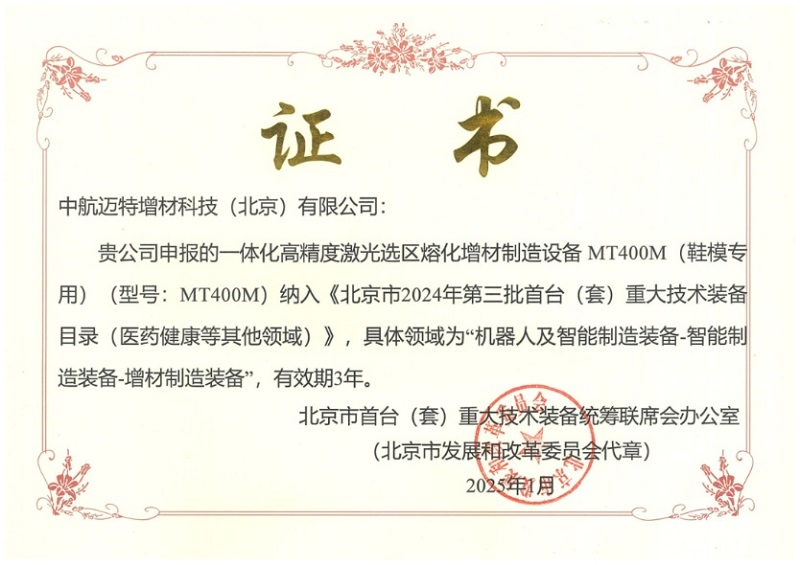 中航邁特:一體化高精度激光選區(qū)熔化(SLM)設(shè)備MT400M成功獲得北京市首臺(tái)(套)重大技術(shù)裝備認(rèn)定,已應(yīng)用于3C、鞋模等多個(gè)領(lǐng)域,實(shí)現(xiàn)核心裝備國產(chǎn)化替代。