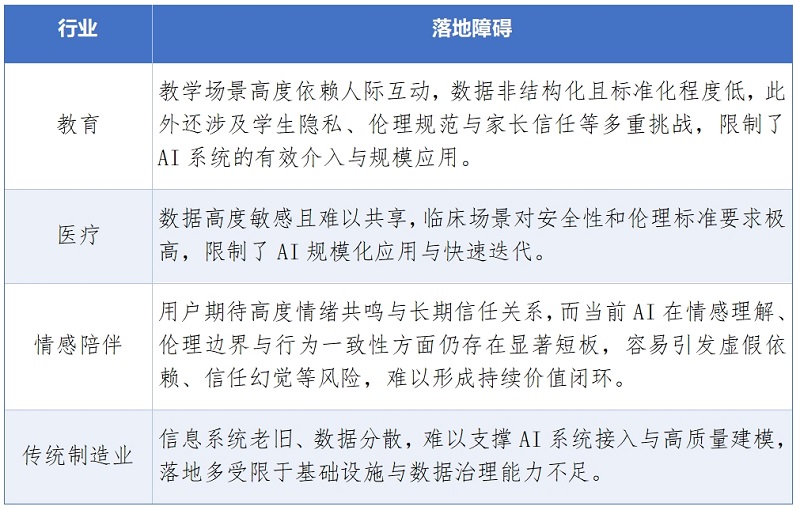 以教育、醫(yī)療和情感陪伴等高潛力領(lǐng)域?yàn)槔?,盡管具備廣闊的應(yīng)用前景,但在實(shí)踐中常受限于數(shù)據(jù)結(jié)構(gòu)化程度低、倫理與監(jiān)管要求高、用戶(hù)信任基礎(chǔ)薄弱等因素,難以實(shí)現(xiàn)快速規(guī)?;涞?。這類(lèi)“技術(shù)前景誘人、落地路徑艱難”的方向,需要更加冷靜面對(duì),以防在資本熱度退卻時(shí)出現(xiàn)估值回調(diào)或資源退潮的風(fēng)險(xiǎn)。