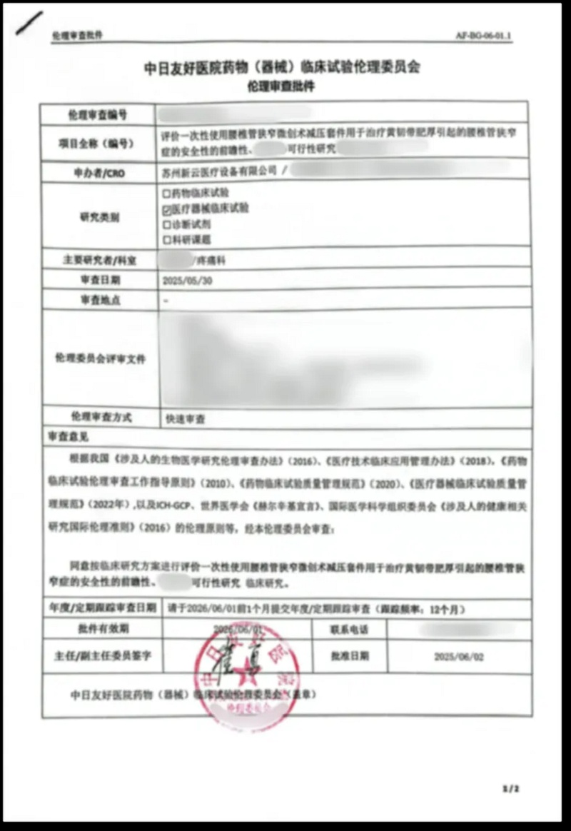 近日,由君創(chuàng)Family企業(yè)北京新云醫(yī)療科技有限公司自主研發(fā)的“一次性使用腰椎管狹窄微創(chuàng)術(shù)減壓套件(NewMild)”,臨床試驗(yàn)項(xiàng)目通過中日友好醫(yī)院藥物(器械)臨床試驗(yàn)倫理委員會(huì)審查,即將在該院疼痛科開展臨床研究。