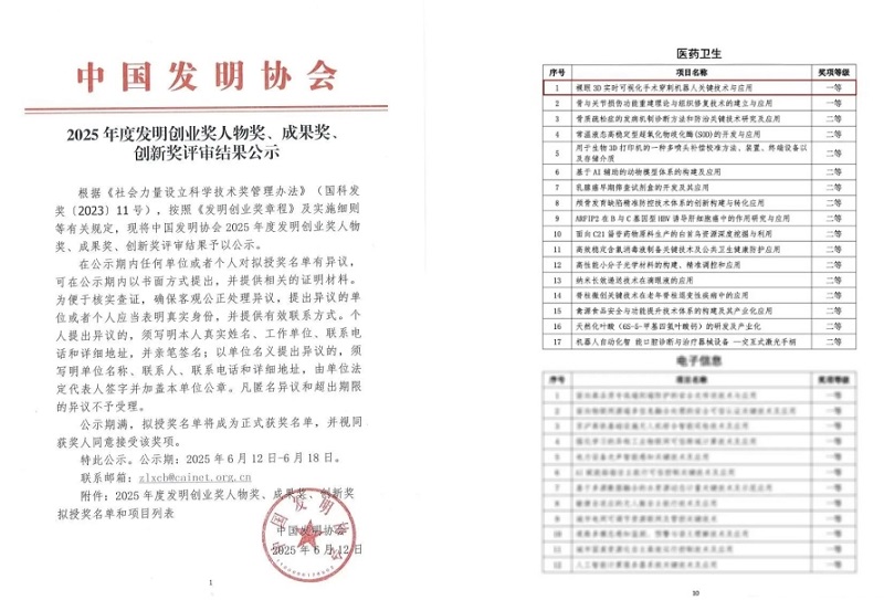 真健康:與合作單位聯(lián)合申報的“裸眼3D實時可視化手術穿刺機器人關鍵技術與應用”項目,榮獲中國發(fā)明協(xié)會2025年度發(fā)明創(chuàng)業(yè)獎成果獎一等獎,為穿刺機器人領域的創(chuàng)新發(fā)展樹立新標桿。