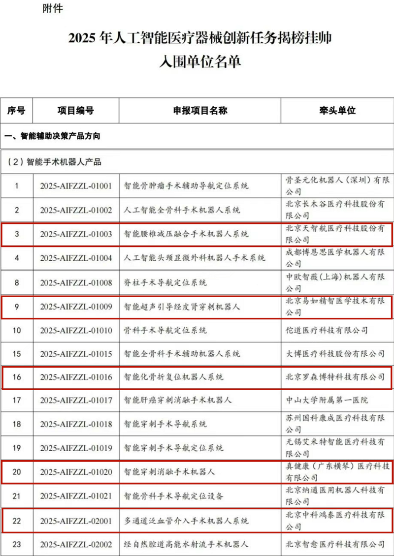 近日,工業(yè)和信息化部科技司、國(guó)家藥品監(jiān)督管理局醫(yī)療器械注冊(cè)管理司對(duì)2025年人工智能醫(yī)療器械創(chuàng)新任務(wù)揭榜掛帥入圍單位名單進(jìn)行了公示。北京天智航醫(yī)療科技股份有限公司(以下簡(jiǎn)稱“天智航”)、北京易如精智醫(yī)學(xué)技術(shù)有限公司(以下簡(jiǎn)稱“易如精智”)、北京羅森博特科技有限公司(以下簡(jiǎn)稱“羅森博特”)、真健康(廣東橫琴)醫(yī)療科技有限公司(以下簡(jiǎn)稱“真健康”)以及北京中科鴻泰醫(yī)療科技有限公司(以下簡(jiǎn)稱“中科鴻泰”)五家君創(chuàng)Family企業(yè)的智能手術(shù)機(jī)器人產(chǎn)品成功入圍。這一成果不僅是對(duì)五家企業(yè)技術(shù)硬實(shí)力、臨床轉(zhuǎn)化能力與創(chuàng)新研發(fā)水平的權(quán)威認(rèn)可,也彰顯了他們?cè)谥悄苁中g(shù)機(jī)器人賽道的創(chuàng)新引領(lǐng)地位。
